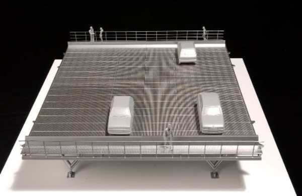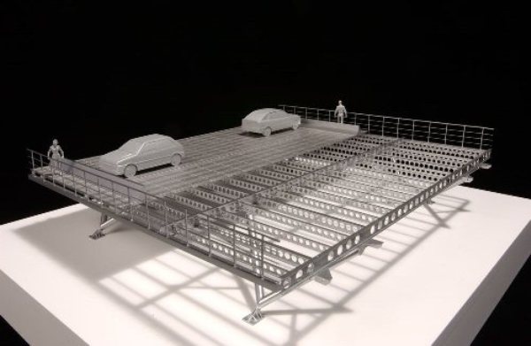 Das völlig de-montierbare Parksystem kann die vorhandene PKW Stellplatzkapazität für bestehende Sportschauplätze, Flughäfen oder kulturelle Einrichtungen verdoppeln, indem einfach eine zweite Parkfläche über einem bestehenden Parkplatz errichtet wird. Die kompakte Stahlstruktur, die mit dem Ingenieurbüro Adams Kara Taylor (AKT London) entwickelt worden ist, kann endlos erweitert werden und lässt sich auf Standard-LKW Container zum Transport verladen.